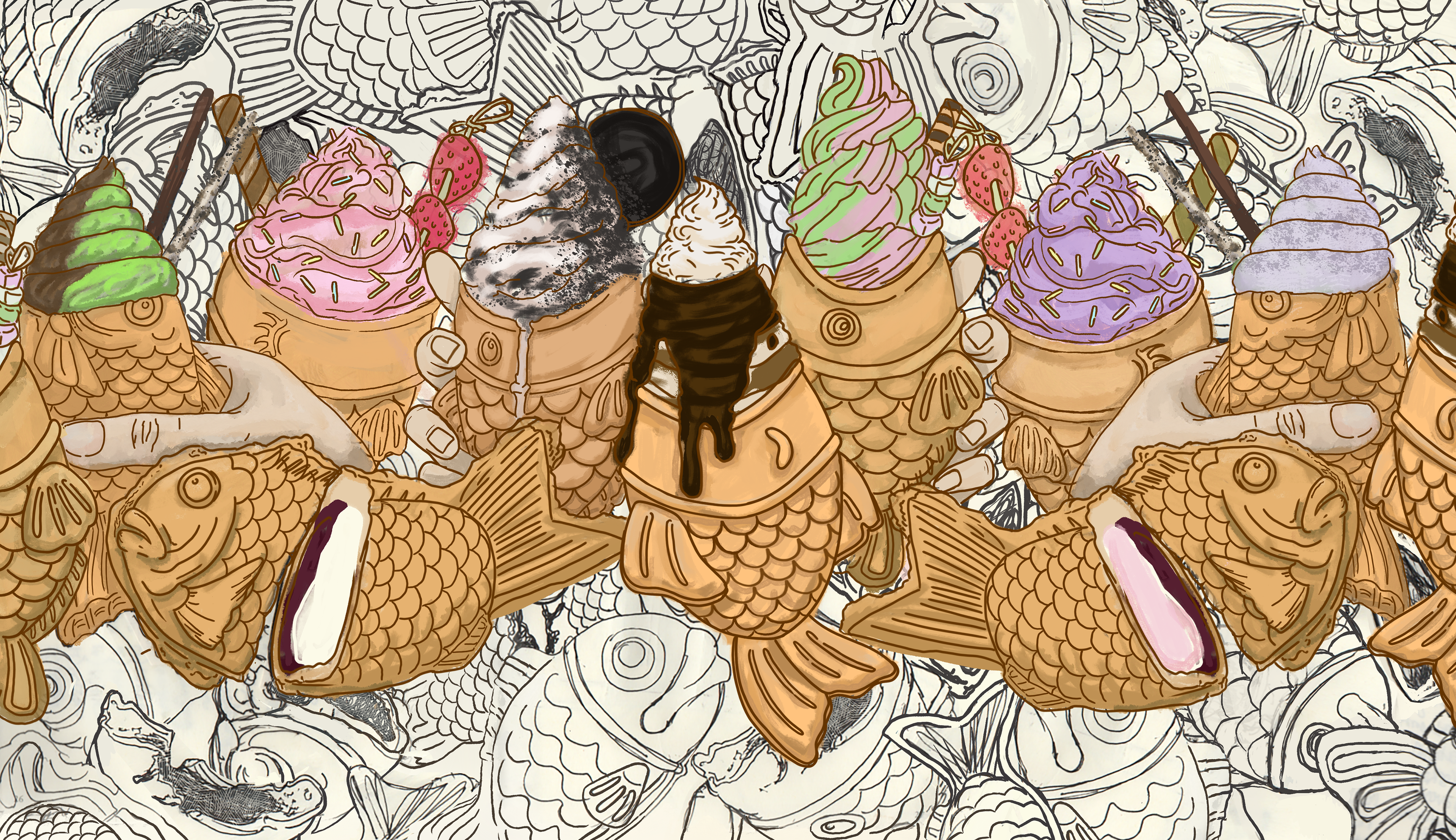 Hand-drawn with pen, then digitized with color added in Photoshop